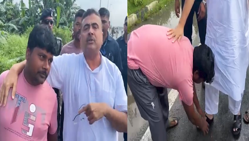 শুভেন্দু বলছেন, মমতার পুলিশ দেখুন, সিভিক ইউনিফর্ম না পরেই ছবি তুলছে। হাইকোর্টের নির্দেশ ইত্যাদি নিয়ে কথা বলতে বলতেই শুভেন্দুর পায়ে