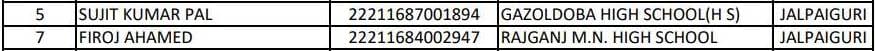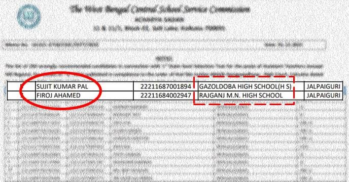 বেআইনি সুপারিশে চাকরি পাওয়া ১৮৩ জনের শিক্ষকের তালিকায় জলপাইগুড়ি জেলার ৮ জনের নাম রয়েছে। এদের মধ্যে রাজগঞ্জ এবং পার্শ্ববর্তী গজলডোবার দুটি স্কুলের দুই শিক্ষকের নাম সেই তালিকায় রয়েছে বলে উল্লেখ করা আছে। তালিকা অনুযায়ী, রাজগঞ্জ মহেন্দ্রনাথ হাই স্কুলের ইতিহাস শিক্ষক ফিরোজ আহমেদ এবং গজলডোবা হাই স্কুলের ভৌত বিজ্ঞানের শিক্ষক সুজিত কুমার পালের চাকরি বেআইনি সুপারিশে হয়েছিল বলে দাবি করা হয়েছে। যদিও ওই নাম এবং বিষয়ে সংলিস্ট স্কুলগুলিতে কোনও শিক্ষক’ই নেই বা ছিলেন না।