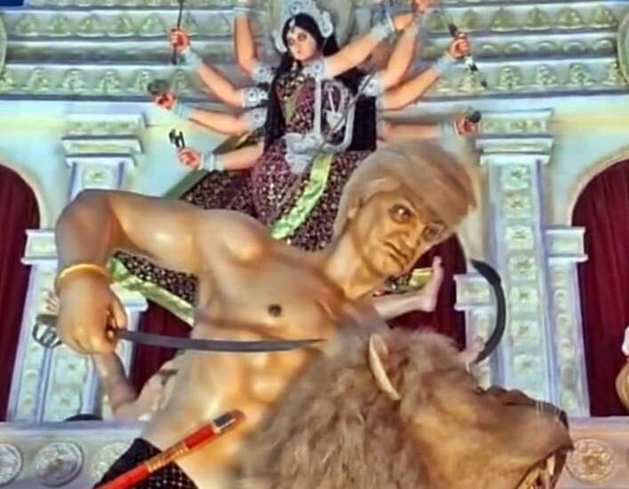 অসুর রূপে ট্রাম্প, বধ করছেন দেবী দুর্গা! বহরমপুরে দুর্গাপুজোয় রাজনৈতিক বার্তা