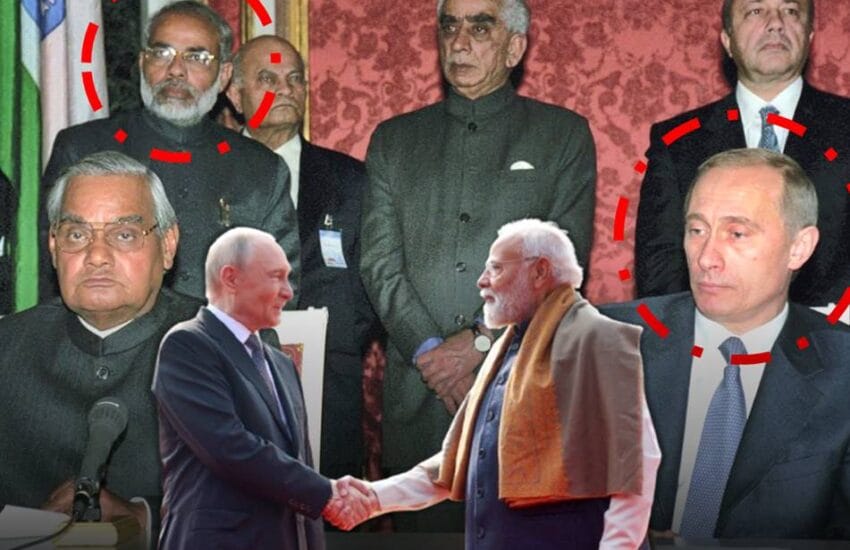 সেই মুহূর্তের ছবি গত বছরই একবার ভাইরাল হয়েছিল। এবার পুতিনের ভারত সফরের আগে আবারও সোশ্যাল মিডিয়ায় ছড়িয়ে পড়ে ছবিটি। দেখা যায়, নথি স্বাক্ষরের সময় বাজপেয়ীর পাশে দাঁড়িয়ে আছেন মোদি, আর সামনে বসে আছেন পুতিন।