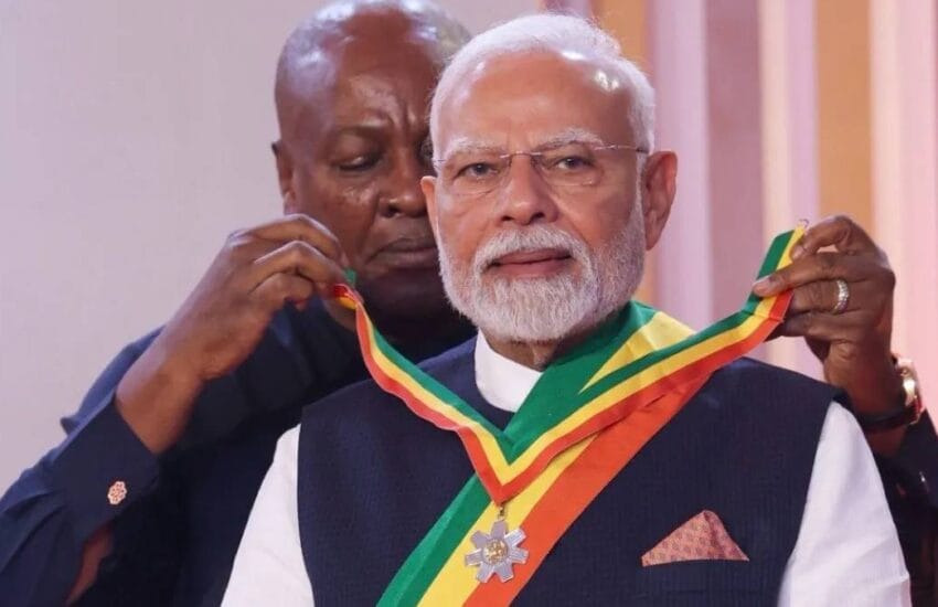 ঘানা সফরের শুরুতেই সম্মানিত হলেন ভারতের প্রধানমন্ত্রী নরেন্দ্র মোদি। পশ্চিম আফ্রিকার এই দেশে দ্বিপাক্ষিক সফরে গিয়ে তিনি পেলেন ঘানার জাতীয় সর্বোচ্চ বেসামরিক সম্মান—”Officer of the Order of the Star of Ghana”। প্রেসিডেন্ট জন মাহামার হাত ধরে এই সম্মান গ্রহণ করেন মোদি। আর এই নিয়ে ২৪টি দেশের সেরা বেসামরিক সম্মান পেলেন মোদী।