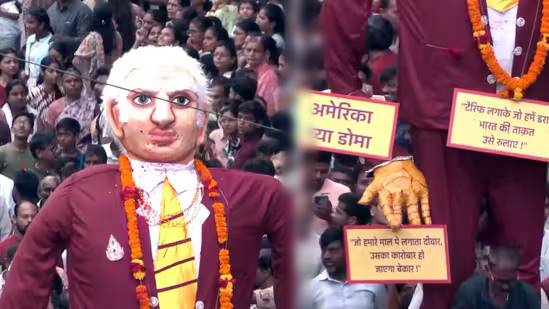 মাটি ও খড় দিয়ে তৈরি ট্রাম্পের এই বিশাল মূর্তি ছিল শোভাযাত্রার কেন্দ্রবিন্দু। তার পাশে ছিল একাধিক প্রতিবাদী প্ল্যাকার্ড, যেখানে লেখা ছিল— “ভারতকে ভয় দেখাতে গিয়ে নিজেরাই ভারতের শক্তি দেখে অবাক!”, “আমাদের পণ্যে শুল্ক চাপিয়ে নিজেদের ব্যবসাই ডুবাবে”, এবং “আমেরিকান কাকা ভারতকে রুখতে চায়, অথচ নিজেই রাশিয়ান পণ্য নেয়!”